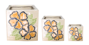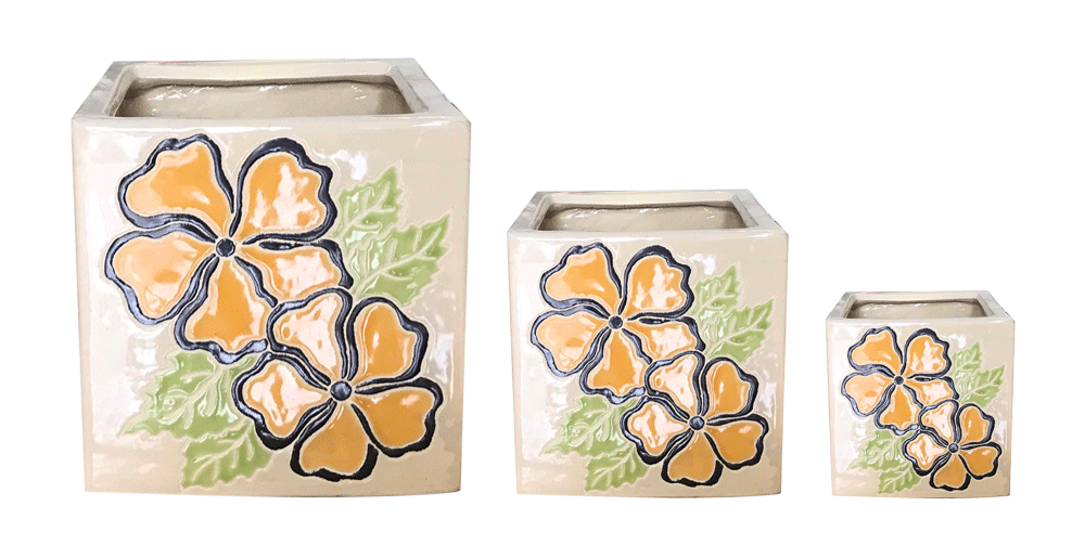 VT.15191 features square planters crafted from high-quality brown clay, finished with a bold hand-painted floral pattern in bright yellow and orange color. Combining traditional Vietnamese craftsmanship with Mediterranean-inspired motifs, these box-shaped pots bring a vibrant touch to both indoor and outdoor spaces—perfect for modern and artistic décor.