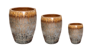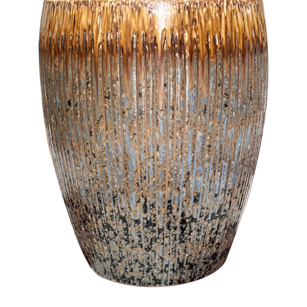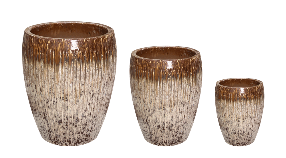 VT.19313 – Brown clay – High shape is inspired by the beauty of the earth and natural springs. This ceramic planter, featuring a variegated glaze, is a sophisticated work of art. The deep brown glaze flows down from the rim, blending seamlessly with the beige glaze on the body to create a graceful and captivating color transition. The vertical stripe pattern not only highlights the product’s clean lines but also evokes a sense of strength and resilience. This planter will be the perfect centerpiece, enhancing the beauty of any plant.