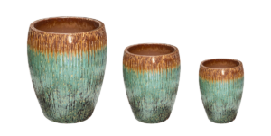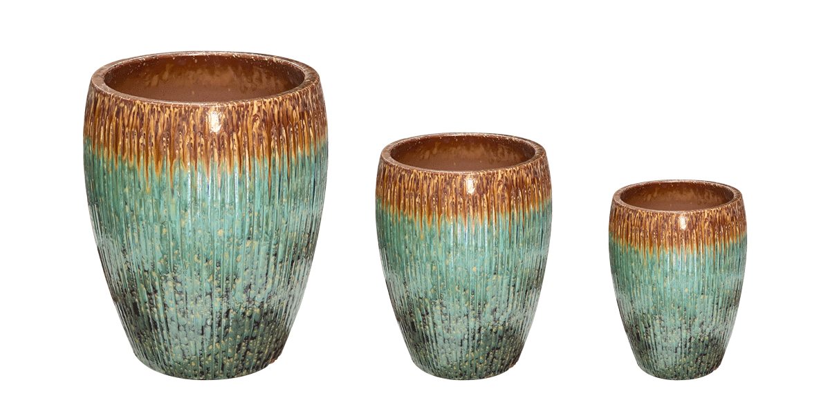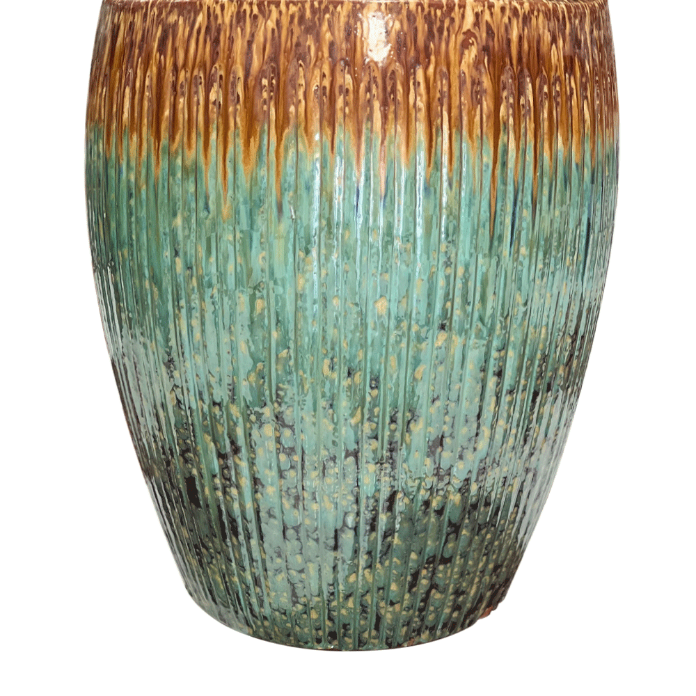 VT.19314 – Brown clay – High shape is inspired by the beauty of the earth and natural springs. This ceramic planter, featuring a variegated glaze, is a sophisticated work of art. The deep brown glaze flows down from the rim, blending seamlessly with the green glaze on the body to create a graceful and captivating color transition. The vertical stripe pattern not only highlights the product’s clean lines but also evokes a sense of strength and resilience. This planter will be the perfect centerpiece, enhancing the beauty of any plant.