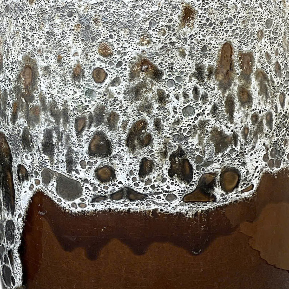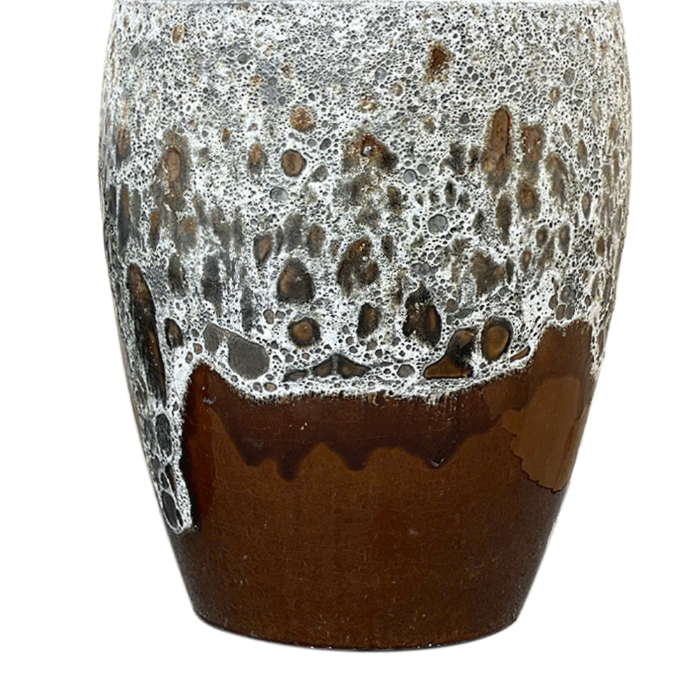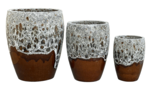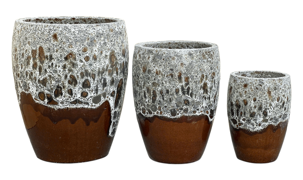 VT.19841 planter set has a modern and natural look. It features a tall shape and a special reactive glaze that creates a unique foamy texture on the surface. The warm brown color, along with the soft white-gray drip around the rim, gives each piece a refined and handcrafted touch.