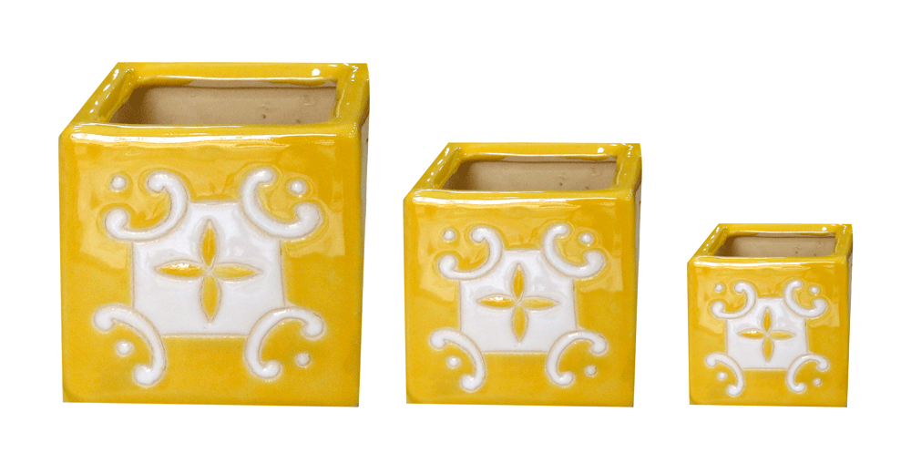 VT.13040 features square planters crafted from high-quality brown clay, finished with a bold hand-painted floral pattern in yellow and white color. Combining traditional Vietnamese craftsmanship with Mediterranean-inspired motifs, these box-shaped pots bring a vibrant touch to both indoor and outdoor spaces—perfect for modern and artistic décor.