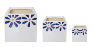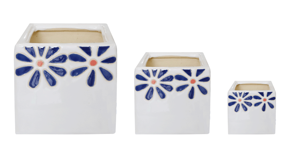 VT.13042 features square planters crafted from high-quality brown clay, finished with a bold hand-painted floral pattern in blue and white color. Combining traditional Vietnamese craftsmanship with Mediterranean-inspired motifs, these box-shaped pots bring a vibrant touch to both indoor and outdoor spaces—perfect for modern and artistic décor.