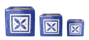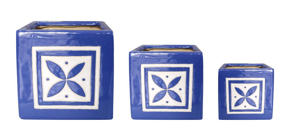 VT.13050 features square planters crafted from high-quality brown clay, finished with a bold hand-painted floral pattern in blue and white color. Combining traditional Vietnamese craftsmanship with Mediterranean-inspired motifs, these box-shaped pots bring a vibrant touch to both indoor and outdoor spaces—perfect for modern and artistic décor.