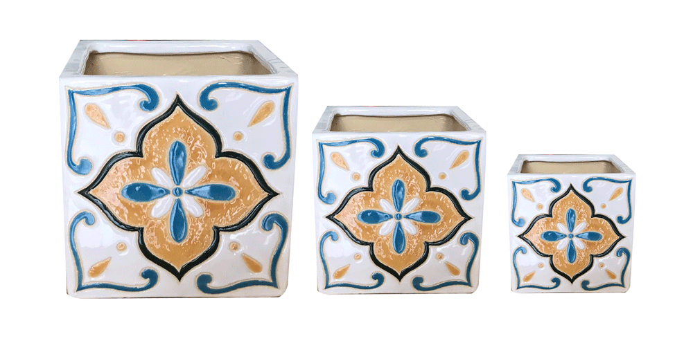 VT.15188 features square planters crafted from high-quality brown clay, finished with a bold hand-painted floral pattern in bright blue and white tones. Combining traditional Vietnamese craftsmanship with Mediterranean-inspired motifs, these box-shaped pots bring a vibrant touch to both indoor and outdoor spaces—perfect for modern and artistic décor.