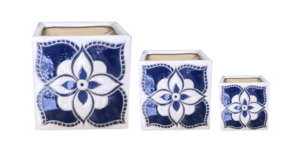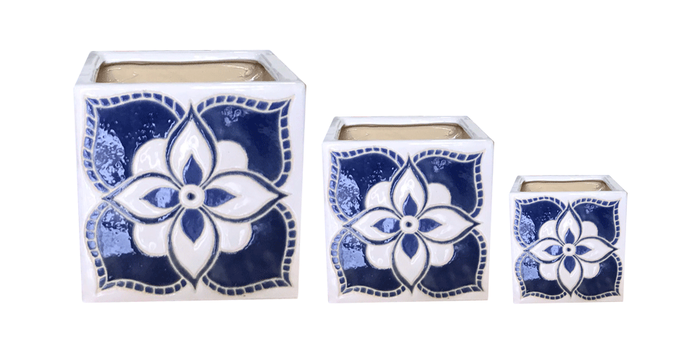 VT.15189 features square planters crafted from high-quality brown clay, finished with a bold hand-painted floral pattern in bright blue and white tones. Combining traditional Vietnamese craftsmanship with Mediterranean-inspired motifs, these box-shaped pots bring a vibrant touch to both indoor and outdoor spaces—perfect for modern and artistic décor.