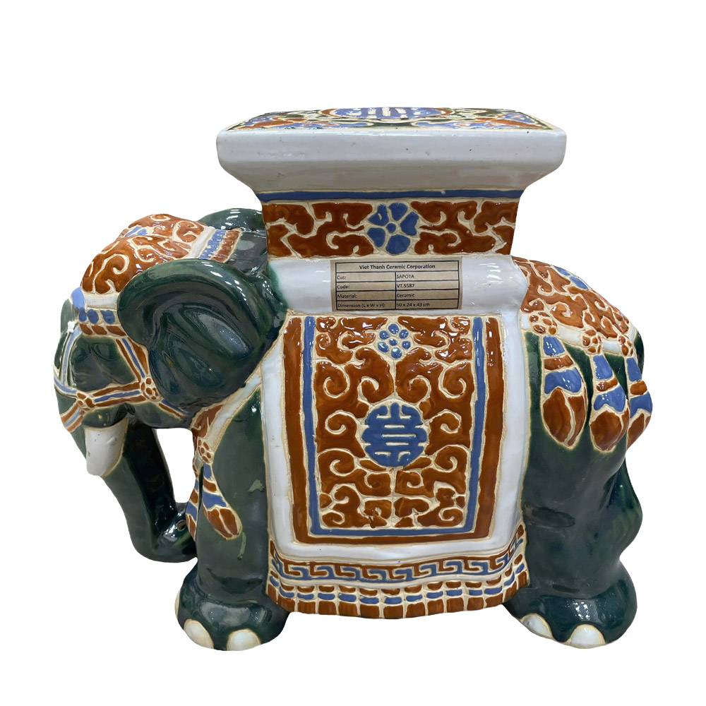 Distinctive Design: Each stool is meticulously crafted in the form of a majestic elephant carrying a square pedestal on its back. Every detail, from the trunk and ears to the decorative saddle cloth and tassels, is finely sculpted, resulting in a vibrant, artistic masterpiece.
