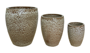 Bộ ba chậu VT.19834 được làm từ đất nung màu nâu tự nhiên, nổi bật với kiểu dáng cao thanh lịch và phần miệng chậu được phủ hiệu ứng men nâu đốm độc đáo. Chậu có độ bền cao, chịu được thời tiết ngoài trời, phù hợp cho sân vườn, quán cà phê, resort hoặc trang trí nhà ở.