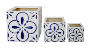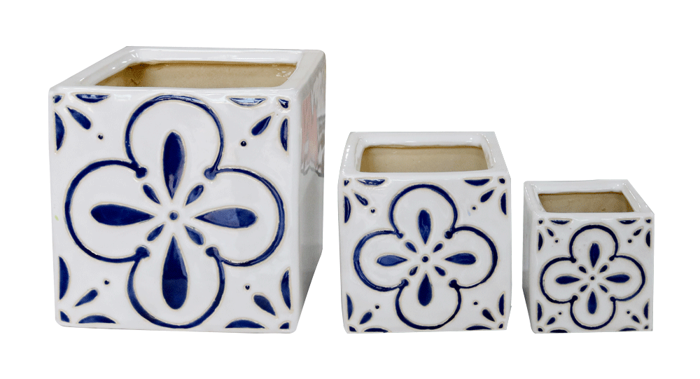 Bộ sưu tập VT.13037 gồm các chậu dáng hộp được làm từ đất nâu cao cấp, trang trí họa tiết hoa văn nổi bật với gam màu xanh – trắng đầy sức sống. Sự kết hợp giữa tay nghề gốm Việt truyền thống và cảm hứng Địa Trung Hải tạo nên nét cuốn hút riêng, phù hợp cho không gian nội thất và ngoại thất hiện đại, giàu tính nghệ thuật.