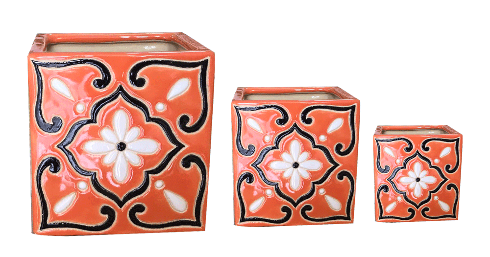 Sản phẩm VT.15187 gồm các chậu dáng hộp được làm từ đất nâu cao cấp, trang trí họa tiết hoa văn nổi bật với gam màu cam – trắng đầy sức sống. Sự kết hợp giữa tay nghề gốm Việt truyền thống và cảm hứng Địa Trung Hải tạo nên nét cuốn hút riêng, phù hợp cho không gian nội thất và ngoại thất hiện đại, giàu tính nghệ thuật.